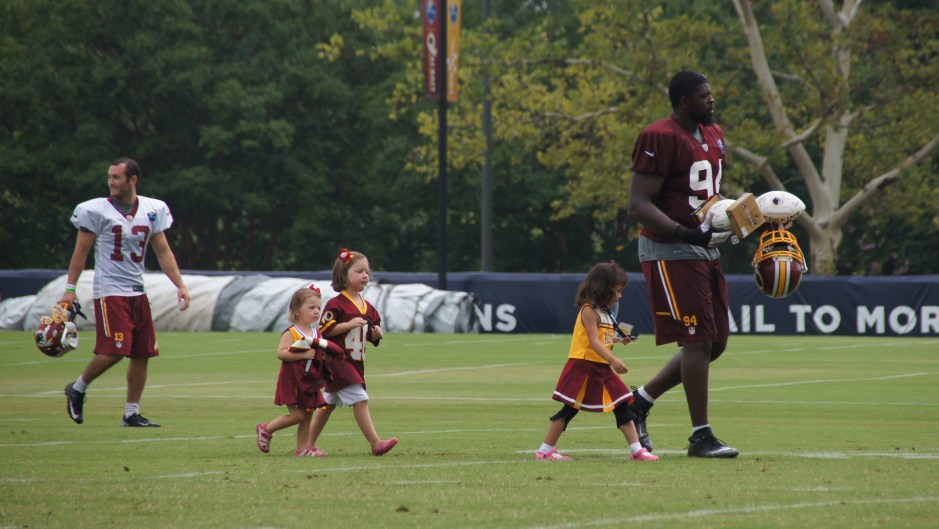 Clifton Geathers walks with some young fans after practice.