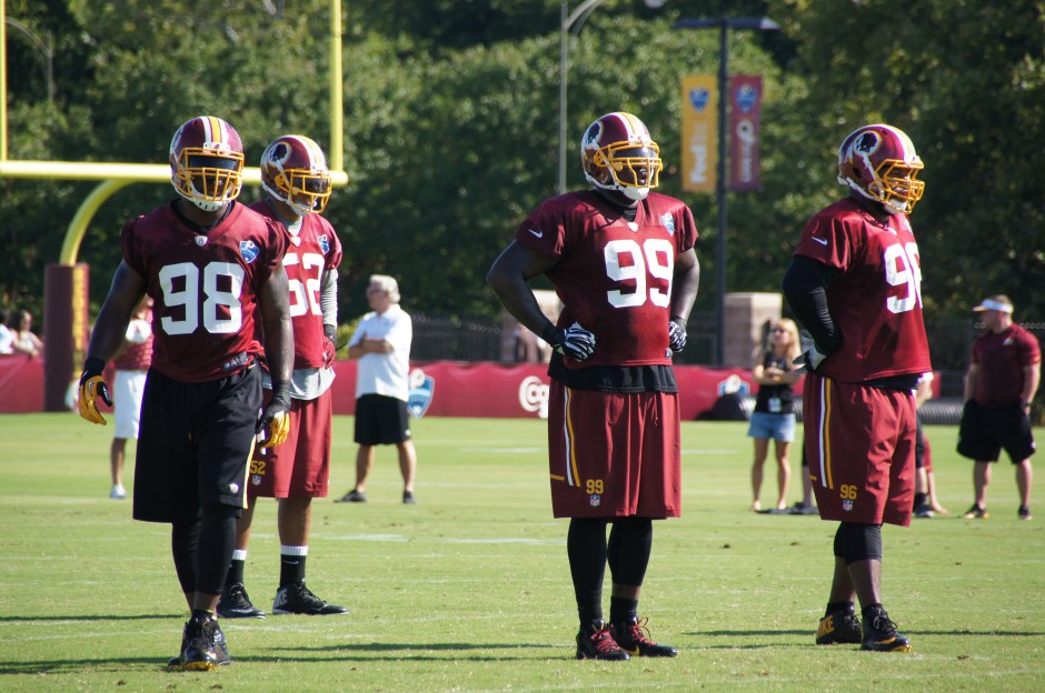 The Redskins defensive line waits for the snap. Photo by Jake Russell.