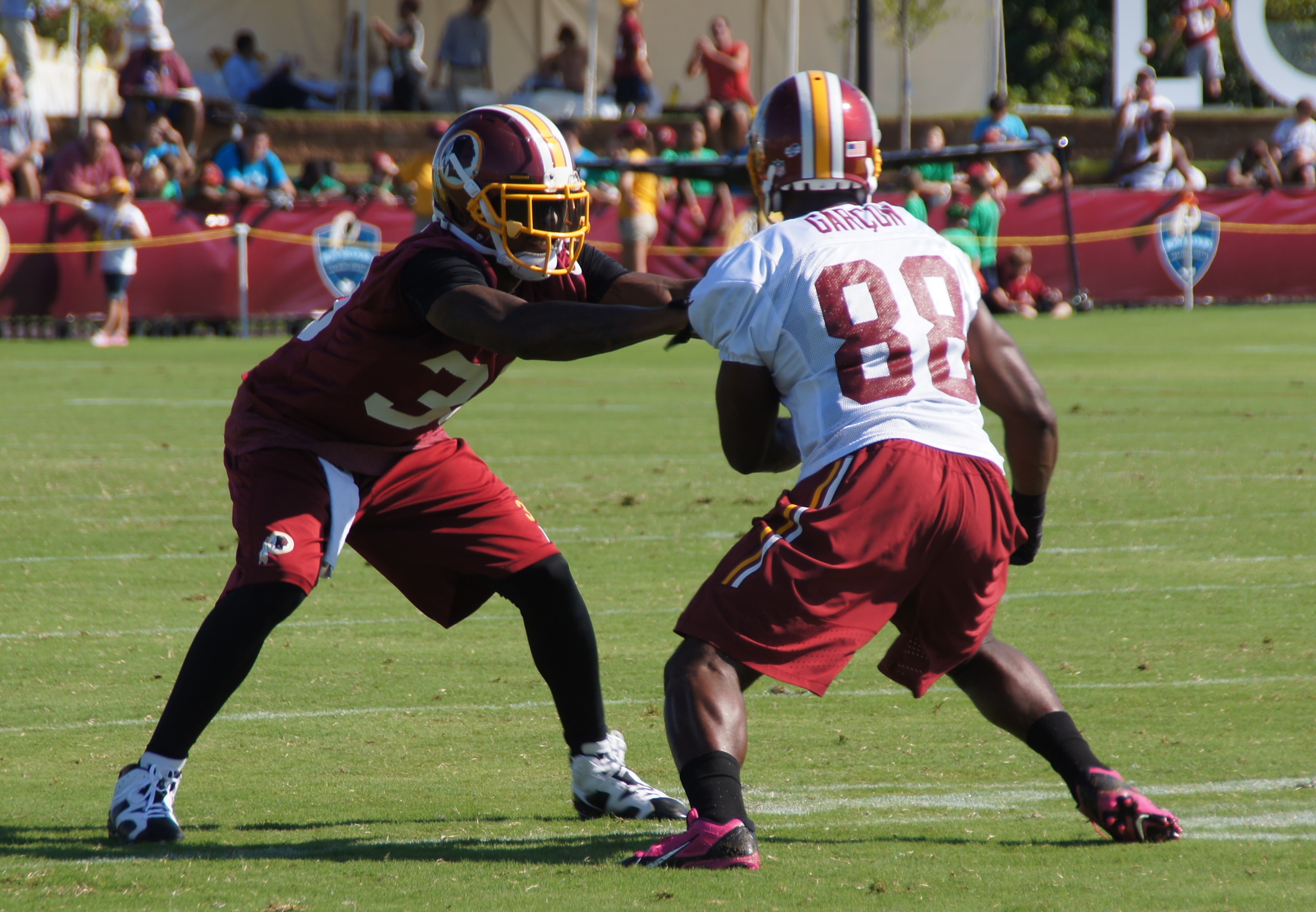 ← Previous Next → Cornerback David Amerson locks up with wide receiver Pierre Garcon. Photo by Jake Russell.