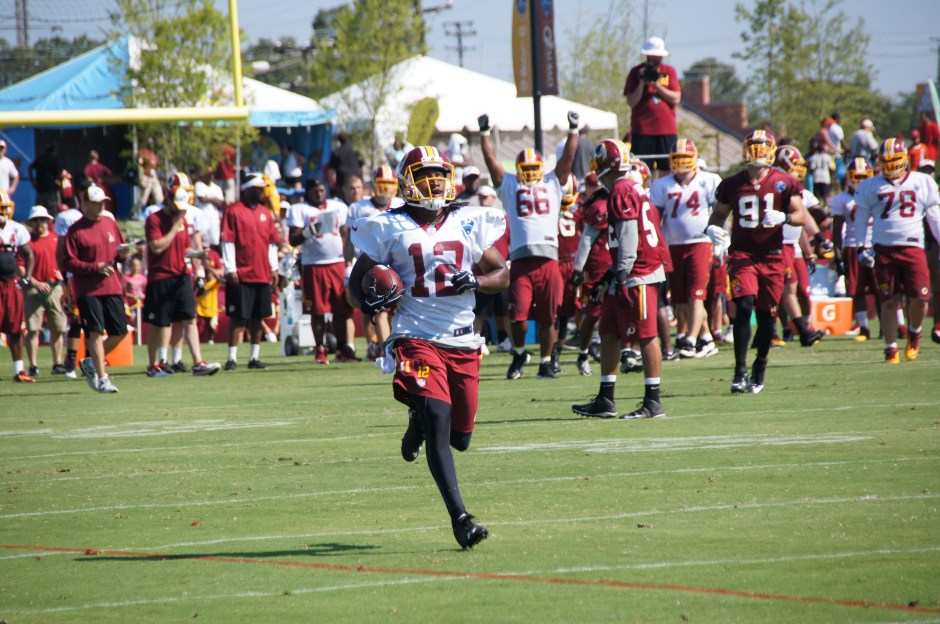 ← Previous Next → Andre Roberts runs upfield after a catch as guard Chris Chester celebrates in the background. Photo by Jake Russell.