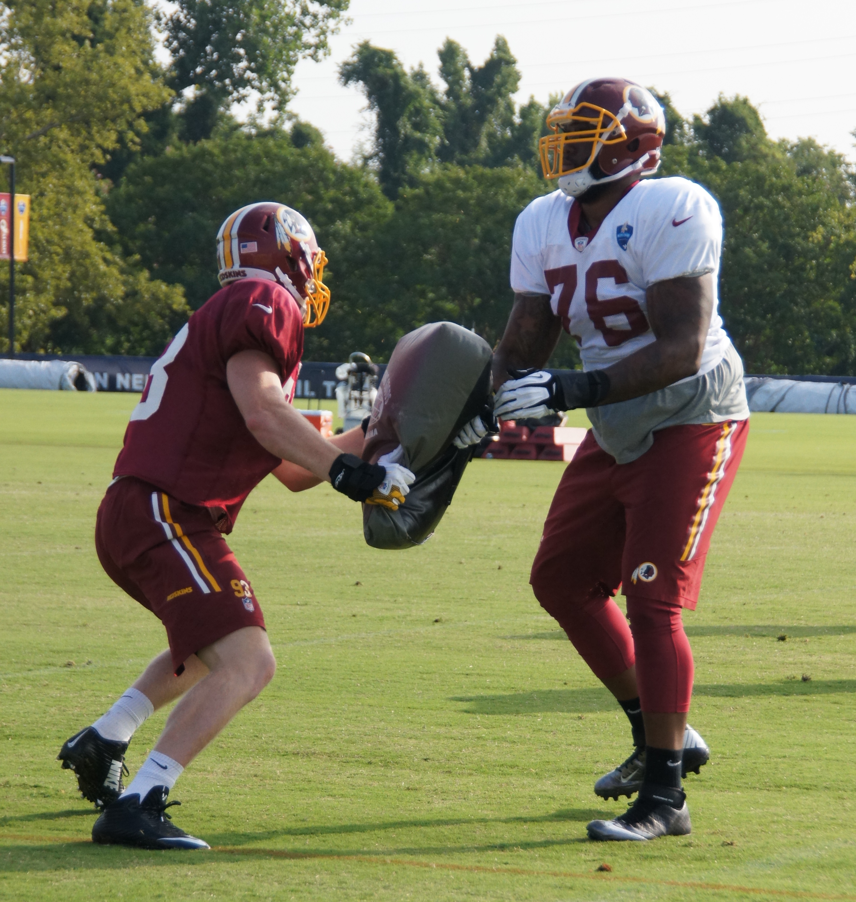 ← Previous Next → Offensive tackle Morgan Moses battles linebacker Trent Murphy during line drills. Photo by Terri Russell.