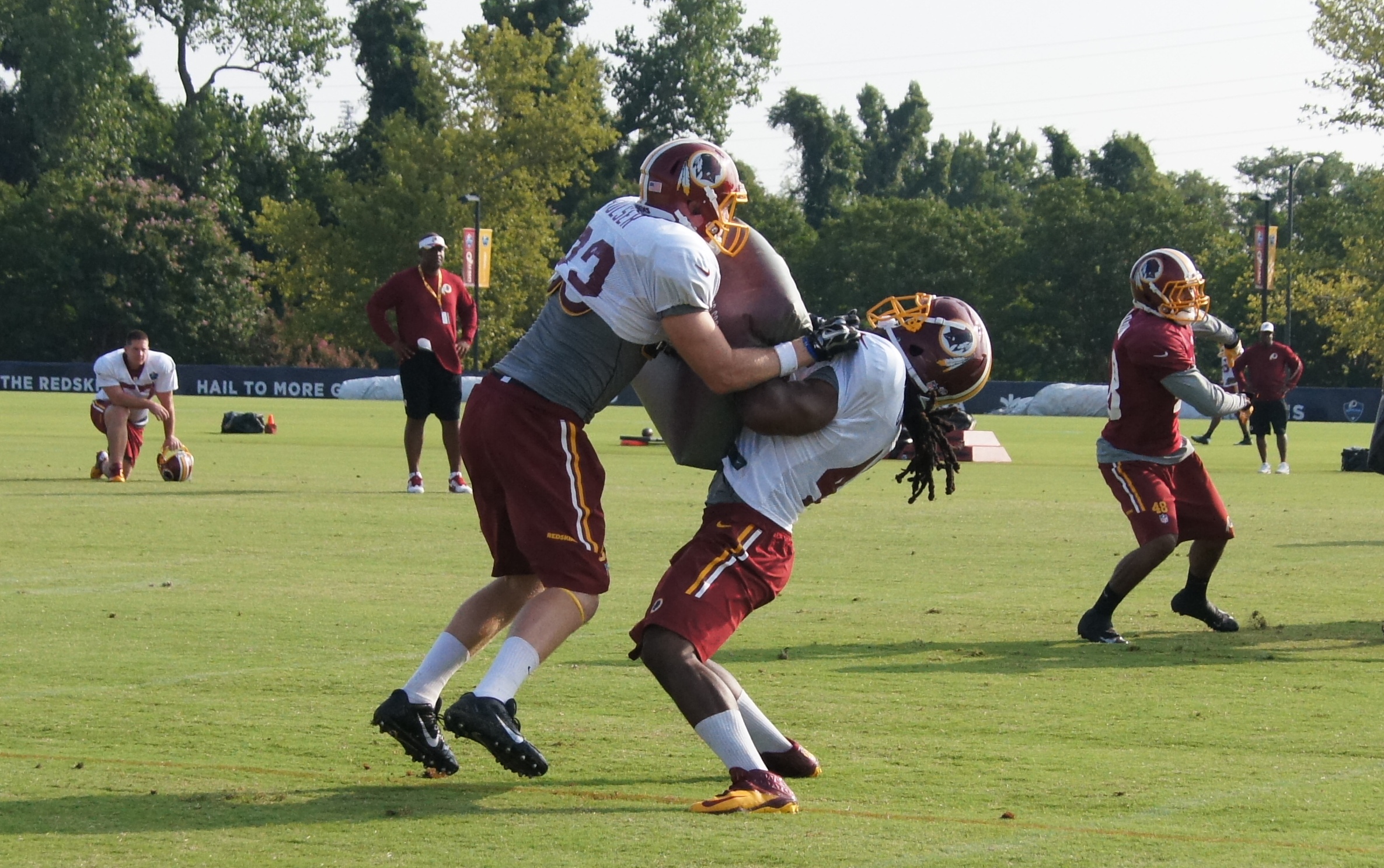 ← Previous Next → Tight end Ted Bolser lays out fullback Stephen Campbell during special teams drills. Photo by Terri Russell.