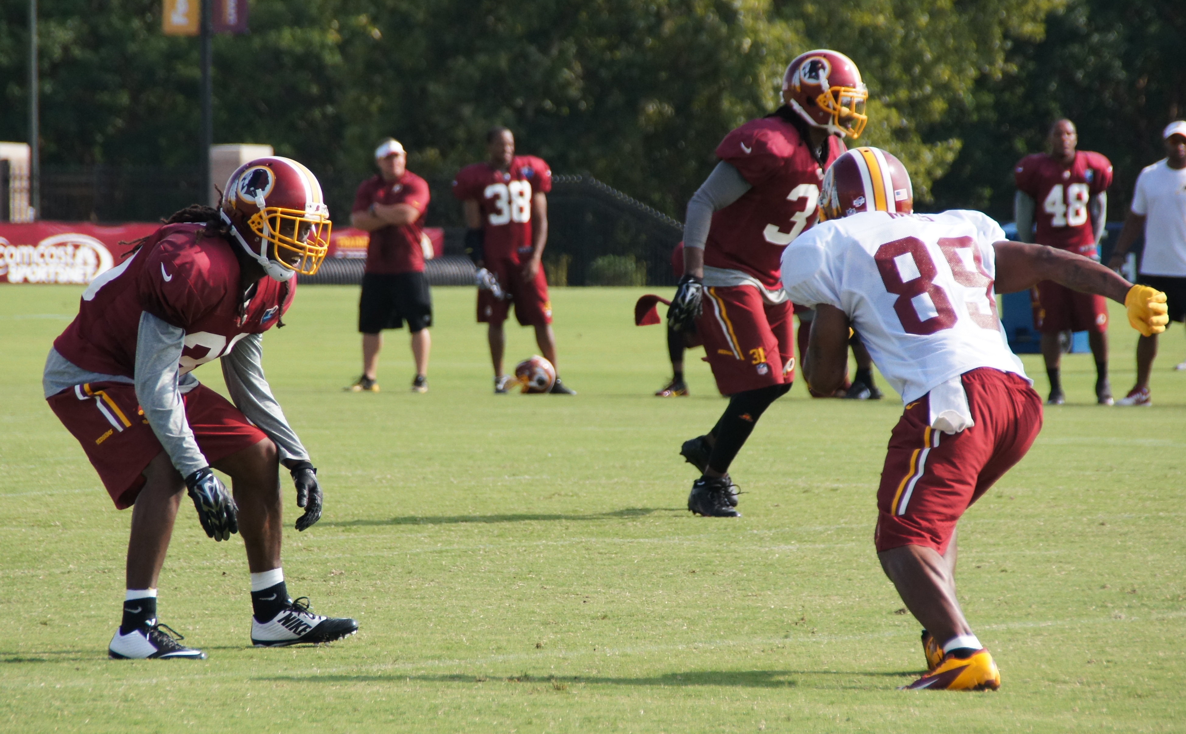 ← Previous Next → Santana Moss runs a route with cornerback E.J. Biggers in coverage. Photo by Jake Russell.