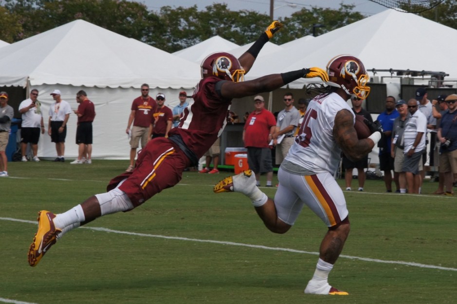 ← Previous Next → Linebacker Martrell Spaight lunges for fullback Jordan Campbell. Photo by Jake Russell.