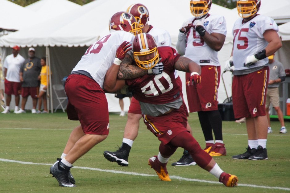 ← Previous Next → Offensive tackle Tom Compton blocked defensive tackle Stephen Paea. Photo by Jake Russell.