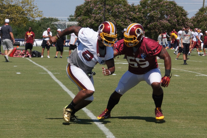 ← Previous Next → Tight end Niles Paul goes against linebacker Adam Hayward in special teams drills. Photo by Terri Russell.