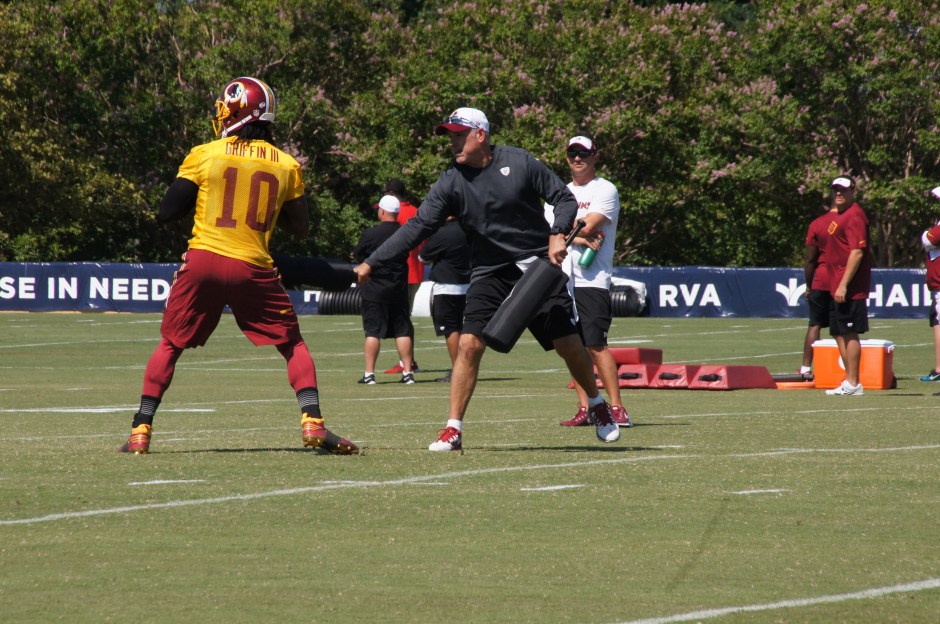 ← Previous Next → Quarterback Robert Griffin III performs a pass pressure drill. Photo by Terri Russell.