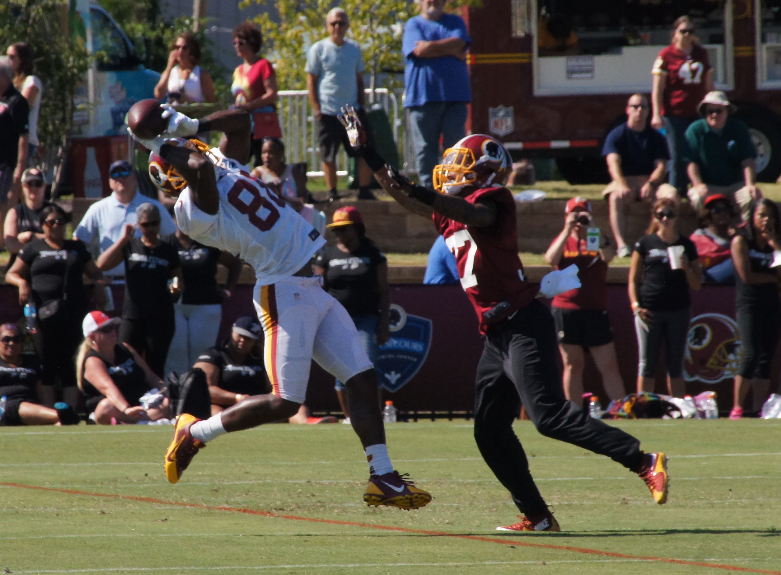 ← Previous Next → Wide receiver Pierre Garcon makes a catch against cornerback Tevin Mitchel. Photo by Jake Russell.