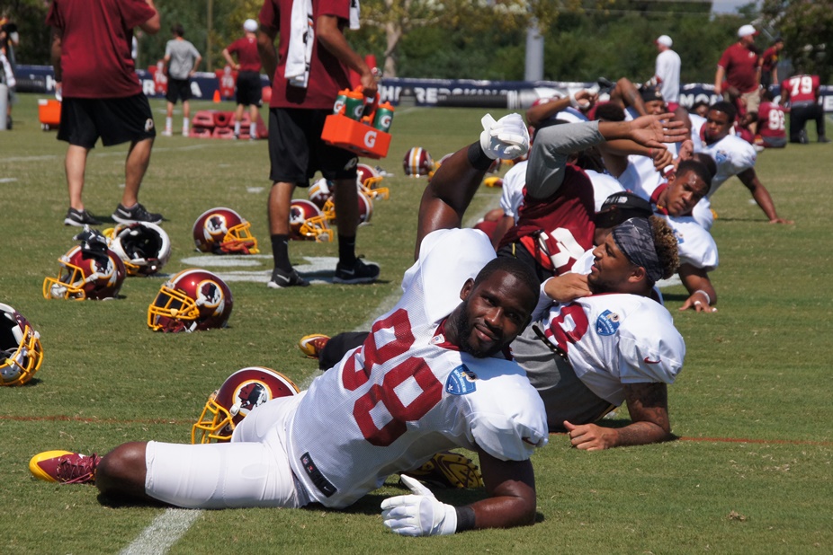 Wide receiver Pierre Garcon stretches before practice. Photo by Terri Russell.