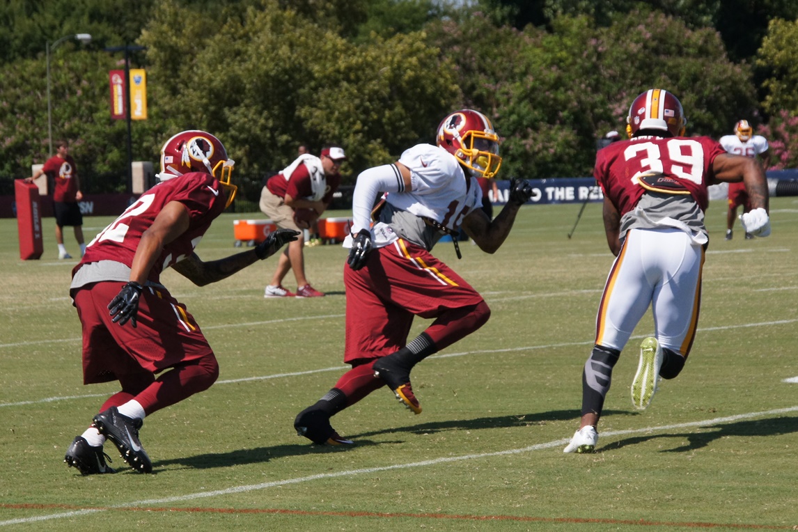 ← Previous Next → Cornerback David Amerson works on special teams drills against cornerback Tajh Hassan and wide receiver Reggie Bell. Photo by Terri Russell.