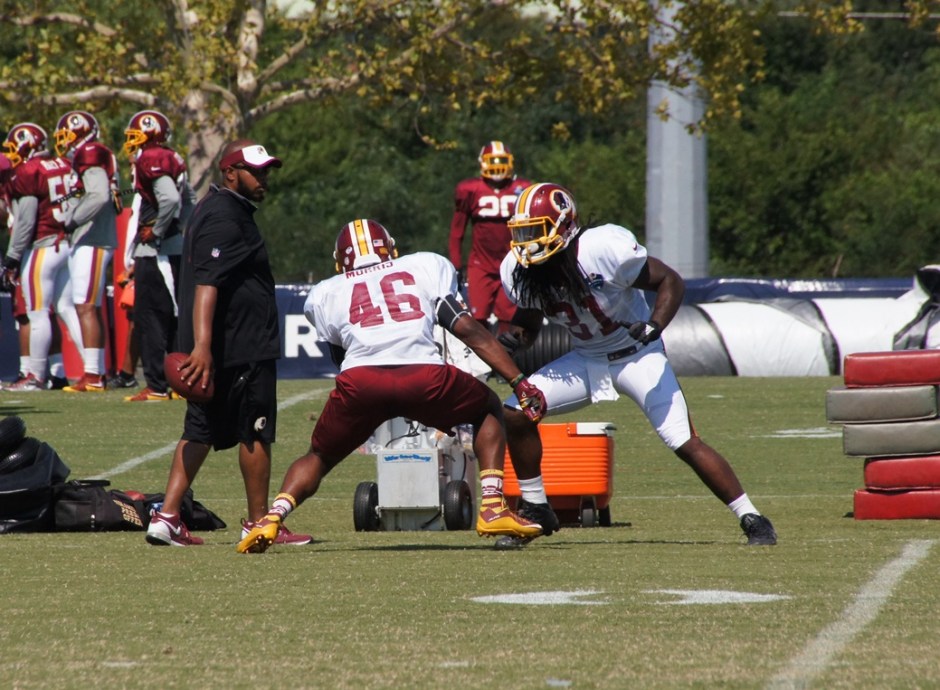 ← Previous Next → Running backs Alfred Morris and Matt Jones take part in a drill. Photo by Jake Russell.