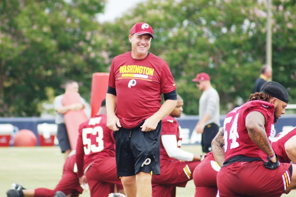 Redskins head coach Jay Gruden looks over Friday afternoon warmups. (Photo by Jake Russell)