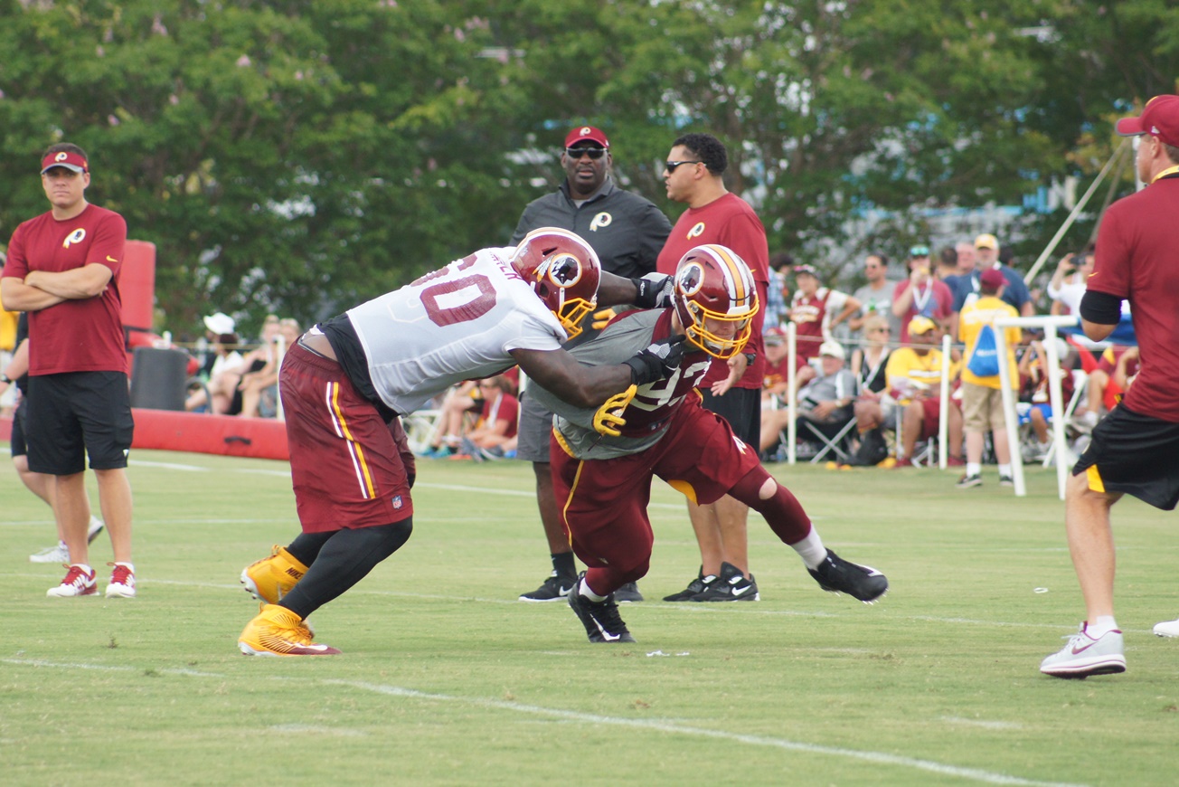 ← Previous Next → Offensive tackle Vinston Painter battles linebacker Trent Murphy. (Photo by Jake Russell)