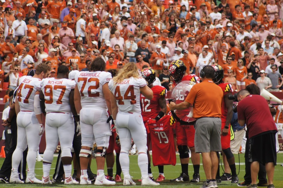 Maryland-Texas08 ← Previous Next → Maryland’s captains hold up Jordan McNair’s No. 79 jersey during the coin toss. (Photo by Jake Russell)