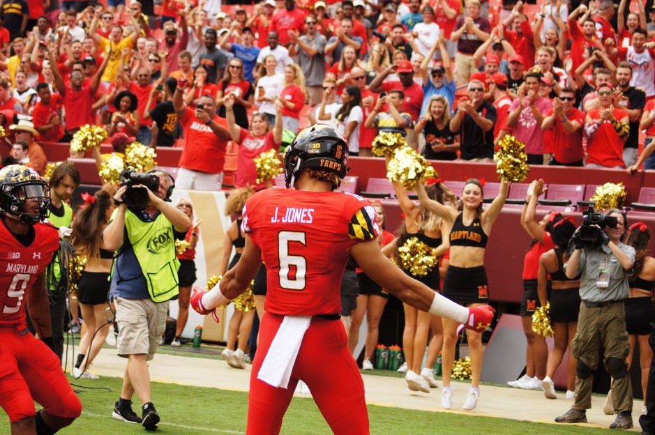 Maryland-Texas12 ← Previous Next → Terps wide receiver Jeshaun Jones celebrates his touchdown run. (Photo by Jake Russell)