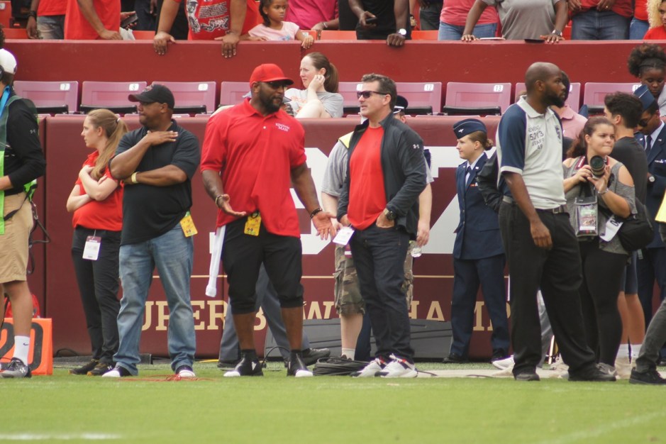 Maryland-Texas18 ← Previous Next → Former Baltimore Ravens linebacker Ray Lewis and Under Armour founder Kevin Plank hold court on the Maryland sideline. (Photo by Jake Russell)