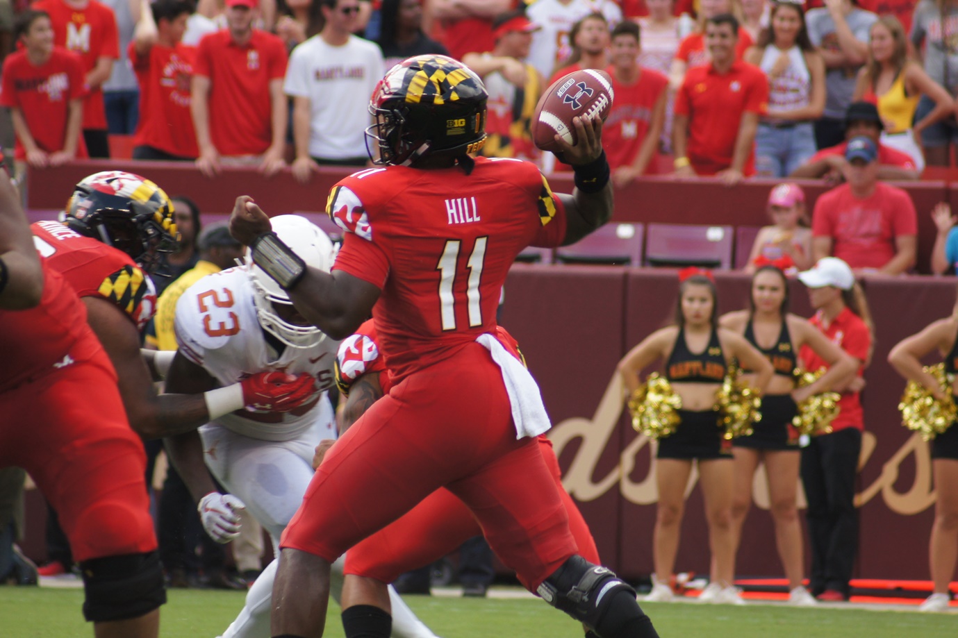 Maryland-Texas22 ← Previous Next → Terps quarterback Kasim Hill attempts a pass. (Photo by Jake Russell)