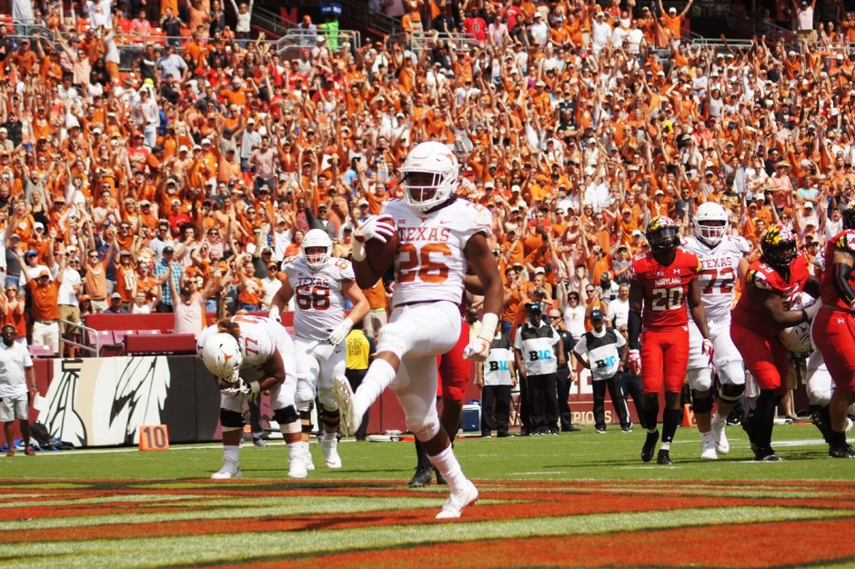 Maryland-Texas25 ← Previous Next → Texas running back Keaontay Ingram scores a touchdown. (Photo by Jake Russell)