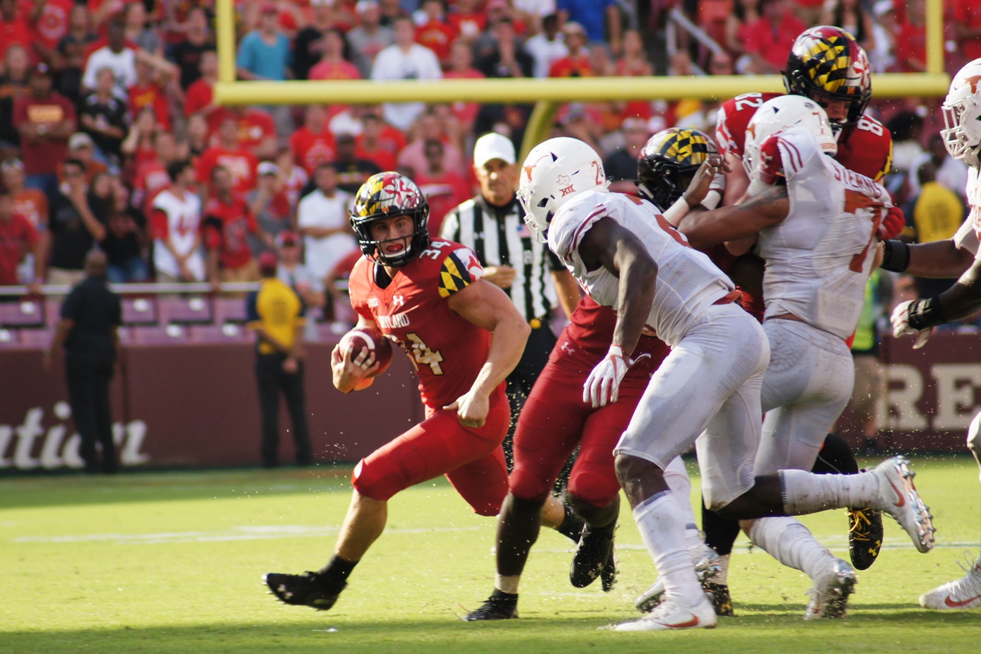 Maryland-Texas31 ← Previous Maryland running back Jake Funk looks for an escape route in Texas’ defense. (Photo by Jake Russell)