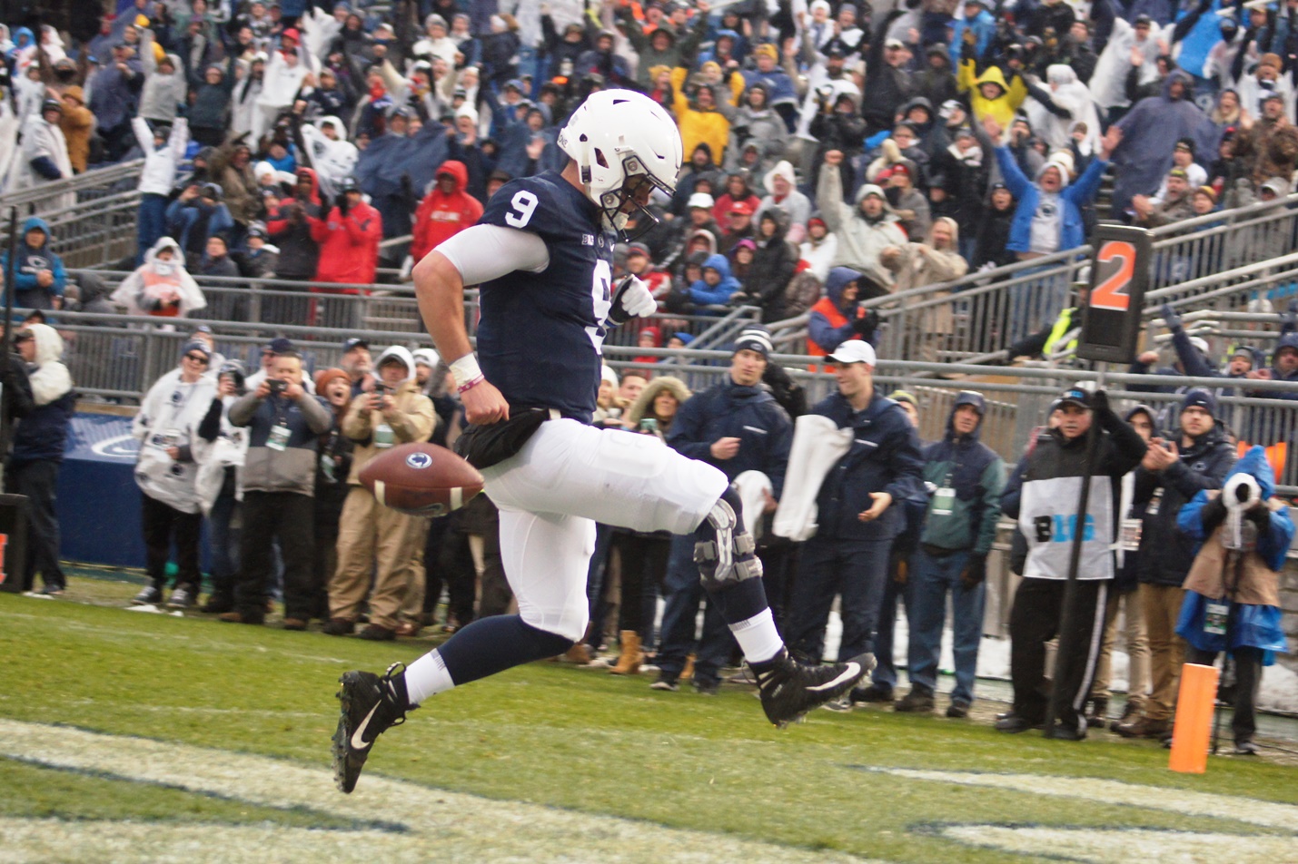 SONY DSC ← Previous Next → Penn State quarterback Trace McSorley high steps into the end zone for his first of two rushing touchdowns on the day. (Photo by Jake Russell)