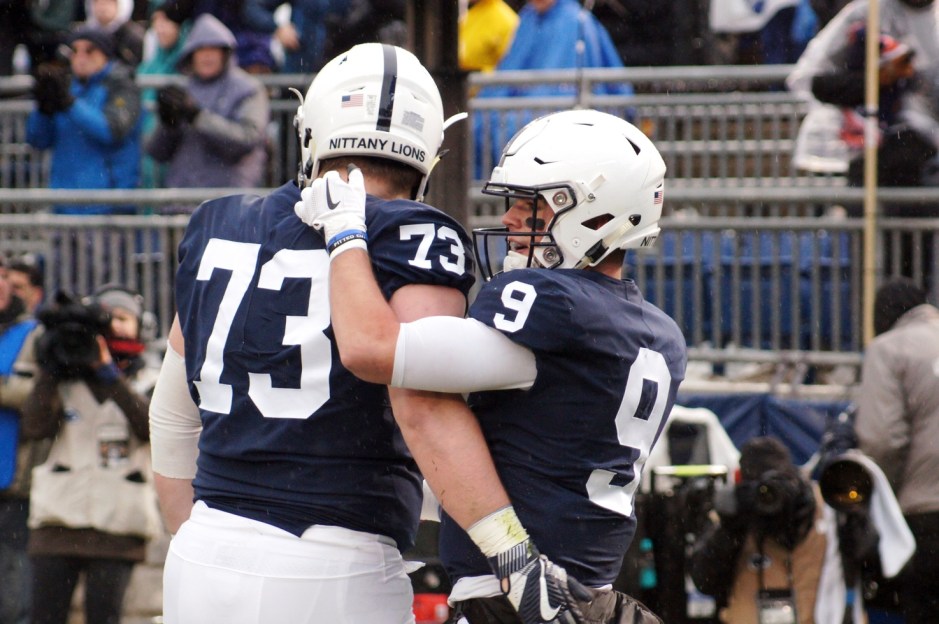 SONY DSC ← Previous Next → Nittany Lions quarterback Trace McSorely and offensive lineman Mike Miranda celebrate McSorley’s touchdown run. (Photo by Jake Russell)