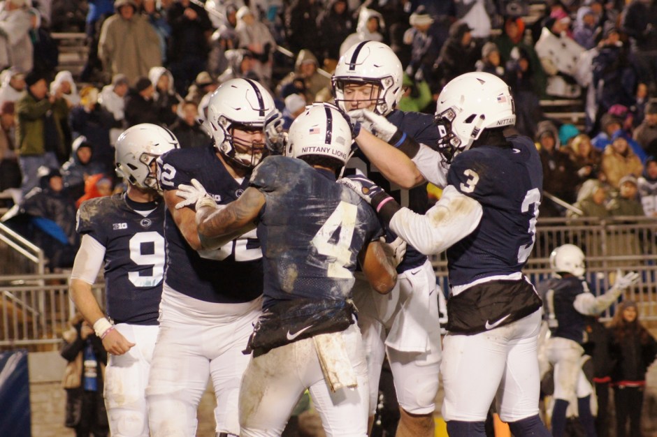 SONY DSC ← Previous Next → The Nittany Lions celebrate running back Ricky Slade’s first rushing touchdown of the game. (Photo by Jake Russell)