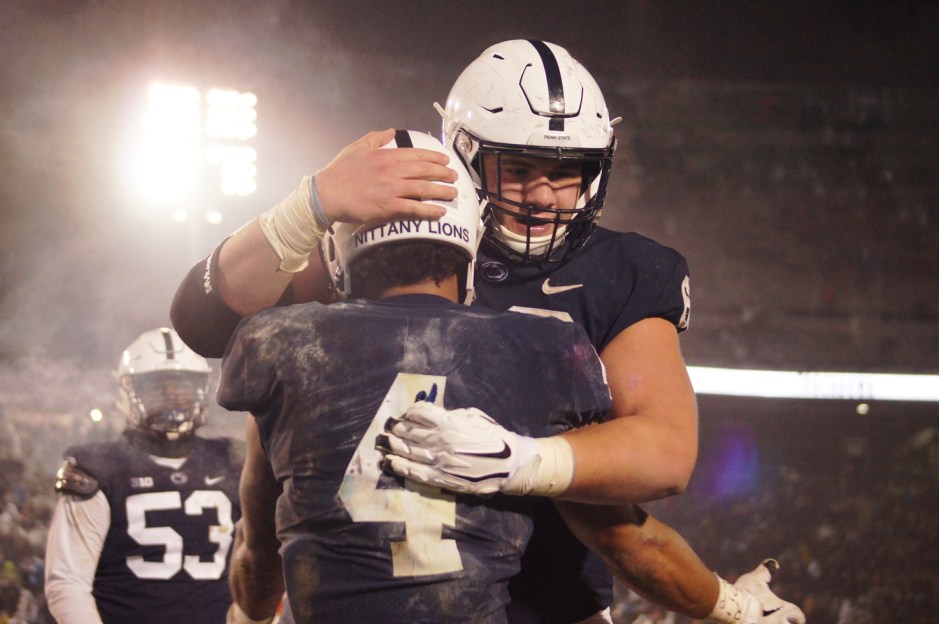 SONY DSC ← Previous Running back Ricky Slade and offensive lineman Connor McGovern celebrate Slade’s second rushing touchdown of the day. (Photo by Jake Russell)
