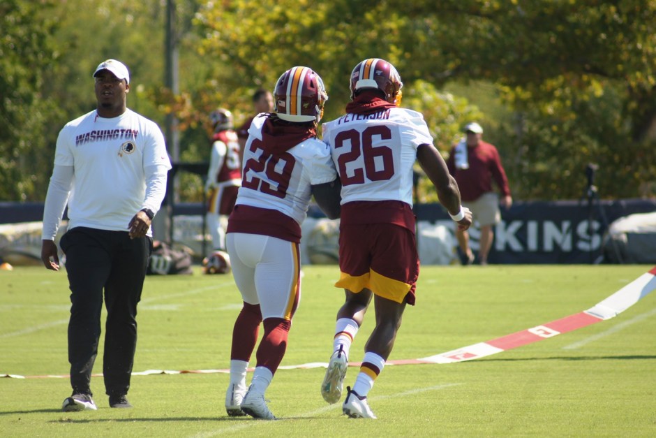 SONY DSC ← Previous Next → Running backs Derrius Guice and Adrian Peterson practice a drill together. (Photo by Jake Russell)