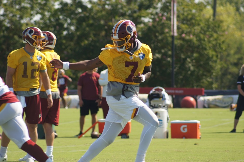 Quarterback Dwayne Haskins hands the ball off. (Photo by Jake Russell)