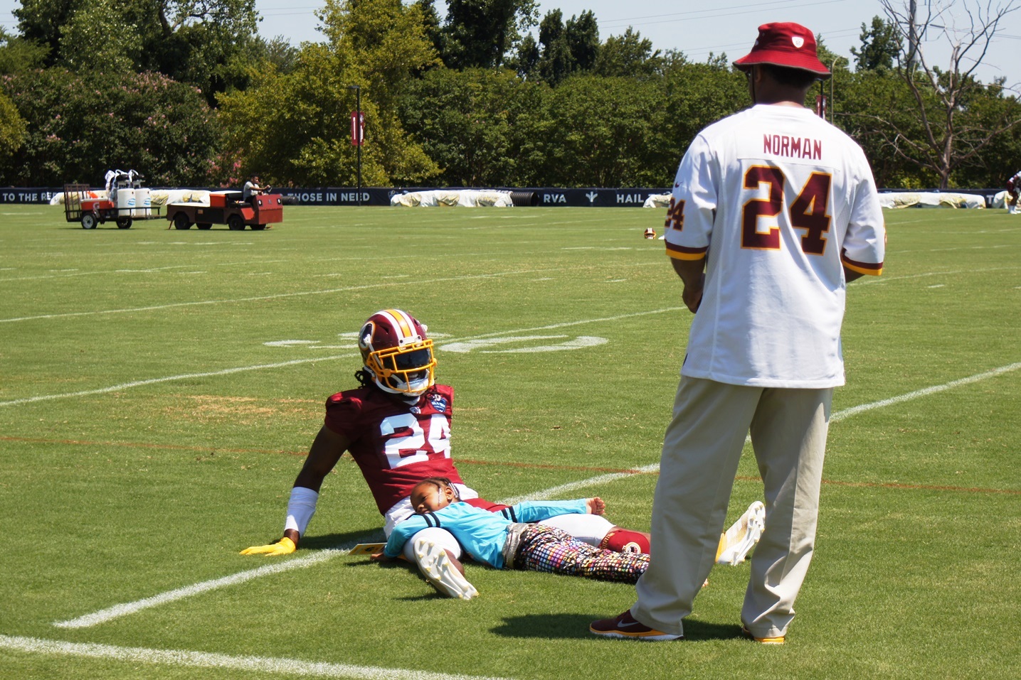 Josh Norman enjoys his post-practice stretches. (Photo by Jake Russell)