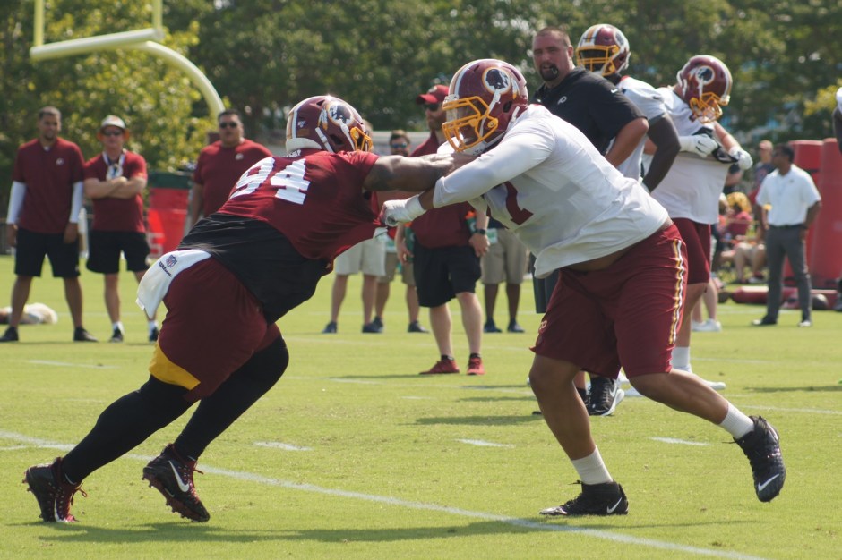 SONY DSC ← Previous Next → Defensive lineman Daron Payne matches up against offensive lineman Ereck Flowers. (Photo by Jake Russell)