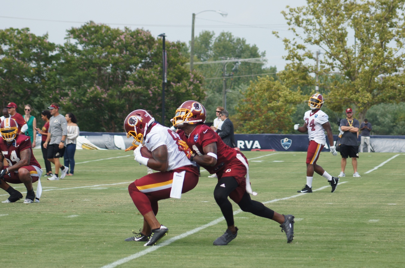 Tight end Manasseh Garner catches a pass in front of safety Will Blackmon. (Photo by Jake Russell)